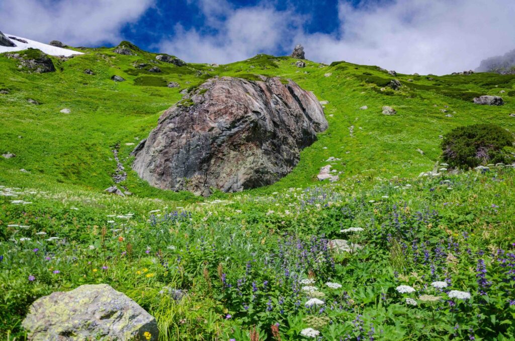 大雪渓を越えると、そこには「天空のお花畑」が待っている